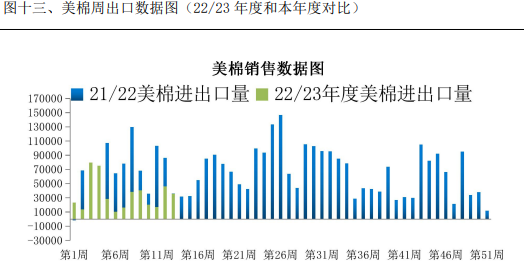 據美國農業部公布的美棉周度出口數據顯示,截至11月3日當周,美國2022/23年度陸地棉凈簽約33067噸,較前一周減少24%;裝運陸地棉24517噸,較前一周減少9%。美棉出口數據環比有所下降。截至2022年11月3日,美國累計凈簽約出口2022/23年度棉花201.4萬噸,達到年度預期出口量的73.99%,累計裝運棉花63.5萬噸,裝運率31.50%。其中陸地棉簽約量為199.0萬噸,裝運62.9萬噸,裝運率31.61%。皮馬棉簽約量為2.4萬噸,裝運0.5萬噸,裝運率22.75%。