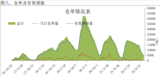 截至11月11日,鄭棉注冊倉單為5160張(22.2萬噸),有效預報32張(1376噸),倉單及有效預報總量為22.3萬噸,11月4日為23.1萬噸,倉單及有效預報有所下滑。