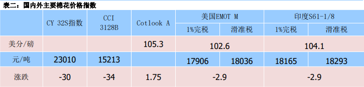 11月15日,現貨指數CCI3128B報價至15213元/噸(-34),期現價差-1938(01合約收盤價-現貨價),滌綸報價7370元/噸(-1100),黏膠短纖報價13000元/噸(+0)CYIndexC32S報價23010元/噸(-30),FCYIndexC32S(進口價格指數)報價25645元/噸(+27);鄭棉倉單5047(-81),有效預報144(+54)。美國EMOTM到港價102.6美分/磅(-2.9);巴西M到港價103.4美分/磅(-2.9)。截止到2022年11月14日,新疆地區皮棉累計加工總量163.31萬噸,同比減幅33.67%。