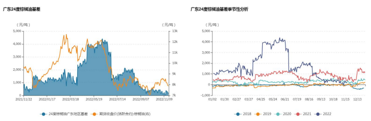 截止至2022年11月18日,廣東地區24度棕櫚油基差212元/噸,較上一交易日上漲40元/噸。從季節性角度來分析,當前廣東地區24度棕櫚油基差較近5年相比維持在較低水平。