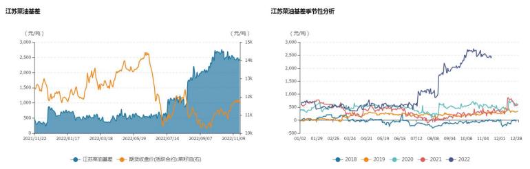 截止至2022年11月18日,江蘇地區菜油基差2455元/噸,較上一交易日上漲59元/噸。從季節性角度來分析,當前江蘇地區菜油基差較近5年相比維持在較高水平。