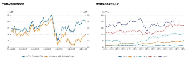 截止至2022年11月18日,江蘇地區四級菜油現貨價格14100元/噸,較上一交易日下跌130元/噸。從季節性角度來分析,當前江蘇地區四級菜油現貨價格較近5年相比維持在較高水平。