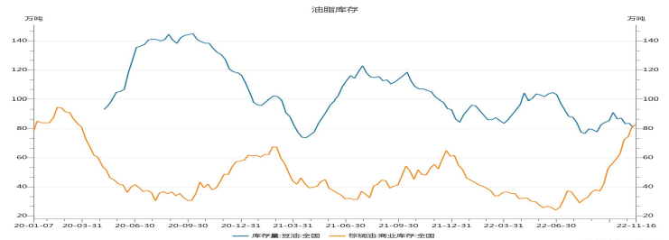 截至2022年11月11日,全國豆油庫存減少2.90萬噸至80.80萬噸。2022年11月16日,全國棕櫚油商業庫存增加1.30萬噸至82.80萬噸。