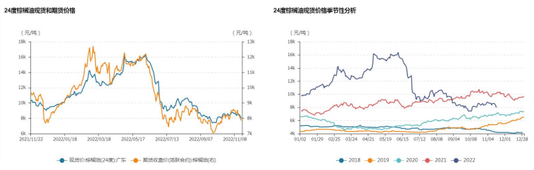 截止至2022年11月18日,廣東地區24度棕櫚油現貨價格8110元/噸,較上一交易日上漲30元/噸。從季節性角度來分析,當前廣東地區24度棕櫚油現貨價格較近5年相比維持在較低水平。