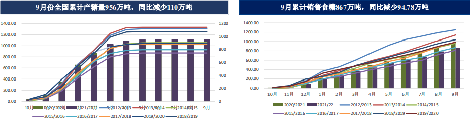 20/21榨季全國食糖產量在1066.66萬噸,同比去年小幅增加。2021/22榨季減產至960萬噸附近。