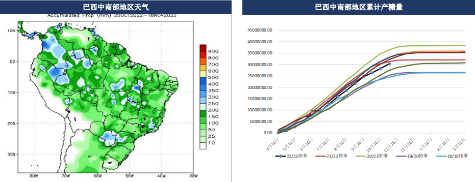 22/23榨季巴西降水前景改善,降水量同比去年增多,蔗料或將有一定恢復。從最新的巴西中南部機構Datagro預估來看,巴西中南部地區2022/23年度甘蔗壓榨量預計為5.62億噸,較去年受霜凍和干旱沖擊的5.25億噸產量相比有所增加。