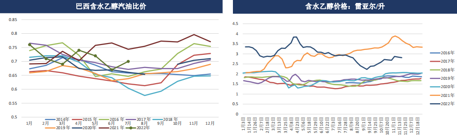 巴西總統正式簽署一系列燃油稅下調法案,鑒于巴西大部分州的汽油ICMS稅率高于含水乙醇并高于提案的17%的最高限制,因此若下調稅率,汽油的降價幅度將高于含水乙醇,可能損及含水乙醇的價格競爭力。4月份巴西全國平均醇油比再次升至73.5%,乙醇價格優勢薄弱,需求受到影響,繼4月份銷量同比下降5.5%之后,5月上半月含水乙醇銷量同比大降24.3%。2022年7月,乙醇和汽油比價為70%。
