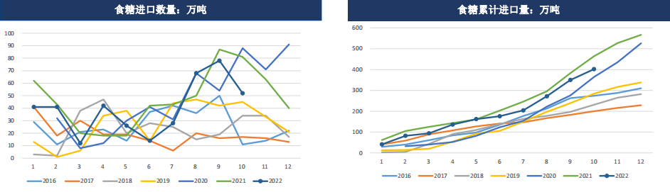 海關總署公布數據顯示,2022年10月我國進口食糖52萬噸,同比減少28.69萬噸,降幅35.56%。2022年1-10月累計進口食糖402.46萬噸,同比減少61.81萬噸,降幅13.31%。