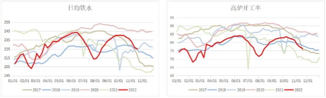 截止本周11月17日,螺紋產量290.67萬噸,較上周減少5.79萬噸,降幅1.95%;螺紋廠庫174.85萬噸,較上周減少6.06萬噸,降幅3.35%;螺紋社庫363.8萬噸,較上周減少15.23萬噸,降幅4.02%;螺紋表需311.96萬噸,較上周減少10.68萬噸,降幅3.31%;建材成交量均值162899,表需下滑明顯,受行業低利潤影響,產量繼續走低。鐵礦港口庫存小幅累庫至13319萬噸,累庫速度低于預期,鐵礦港口成交量小幅抬升,高爐開工率以及日均鐵水受淡季及低利潤影響繼續走低,分別下降至76.35%和226.35萬噸每天,鋼廠庫存保持低位,采購情緒不高,鐵礦到港量維持高位,基本面現實偏弱。