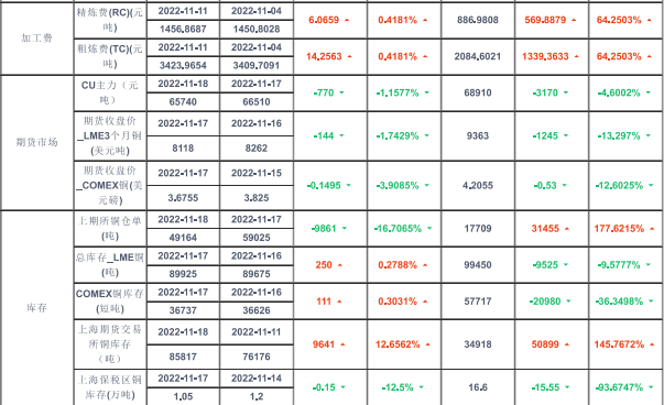 宏觀:美國10月未季調CPI年率錄得7.7%,同比增速創九個月新低。美國通脹數據回落,未來美國加息速度大概率會降低。這種預期使得美元走弱,對銅價構成支撐。不過隨若加息進入后半程,利率上行將對銅價構成壓力,市場預期也有可能會隨時轉變。