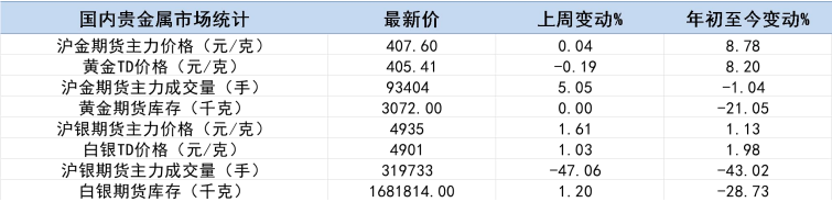 國內貴金屬市場亦總體震蕩,白銀漲幅逾1%。上周上期所黃金成交微增5%,但白銀成交則驟減47%。國內黃金庫存維持不變,白銀庫存增加1.2%至1682噸。