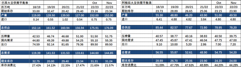 USDA巴西、阿根廷供需平衡表: