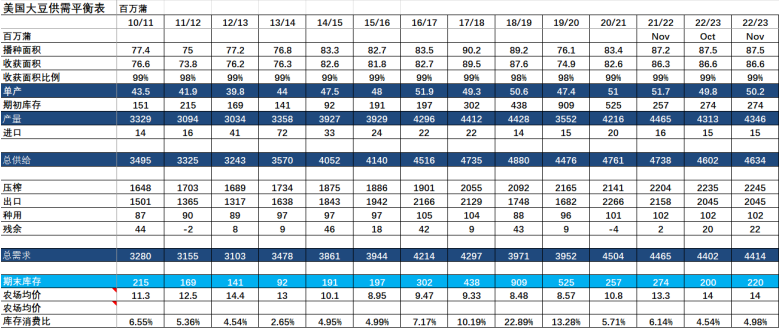 2021/22年度美豆庫存2.7億蒲式耳,新季2022/23年度美豆庫存由上月的2億上調至2.2億蒲式耳,庫存處于偏低水平。