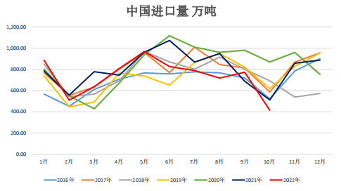 海關總署發布的:中國10月大豆進口量為413萬噸,環比減少358萬噸,減幅46%;同比減少98萬噸,減幅19%。2022年1至10月大豆進口7317萬噸,同比減少592萬噸,減幅7.4%。