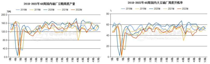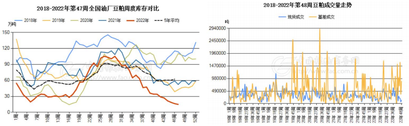 中國糧油商務網監測數據顯示,止到2022年第47周末,國內豆粕庫存量為14.9萬噸,較上周的16.3萬噸減少1.4萬噸,環比下降8.59%;合同量為420.5萬噸,較上周的468.3萬噸減少47.8萬噸,環比下降10.22%。