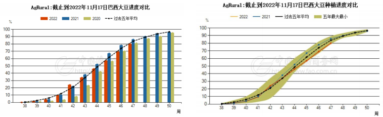咨詢公司AgRural稱,截至11月17日,巴西2022/23年度大豆播種面積已經達到預期面積的80%,高于一周前的69%,但是低于2021年的86%。