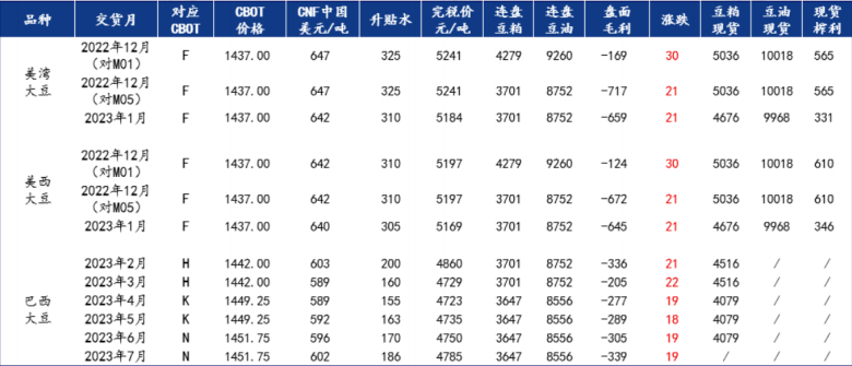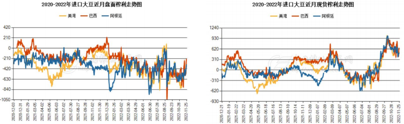 美灣12月船期盤面榨利為-169元/噸;美西12月船期盤面榨利為-124元/噸;巴西2月船期盤面榨利為-336元/噸。