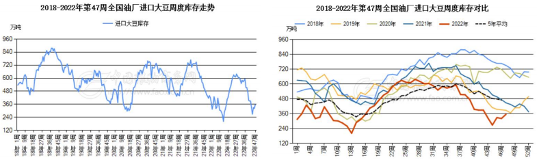 中國糧油商務網監測數據顯示,截止到2022年第47周末,國內進口大豆庫存總量為355.4萬噸,較上周的322.0萬噸增加33.4萬噸,去年同期為474.2萬噸,五周平均為320.4萬噸。其中:沿海庫存量為279.0萬噸,較上周的249.9萬噸增加29.1萬噸,去年同期為375.0萬噸,五周平均為251.3萬噸。