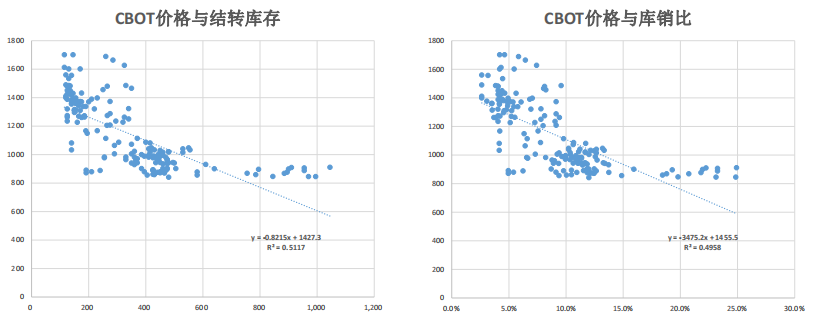 通過對近10年USDA每個月公布的的結轉庫存和庫銷比的數值,和該月的CBOT指數價格進行回歸,我們得出散點圖如下面兩圖所示。