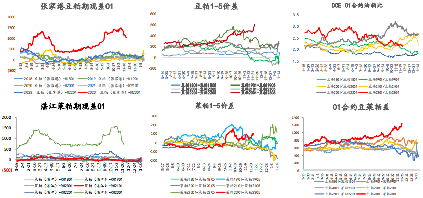 價差回顧-近月到港預期增加,開機好轉,粕類基差回落;年后到港仍然緊張,1-5維持高位;菜籽到港增加,且菜粕需求淡季,豆菜持續擴大