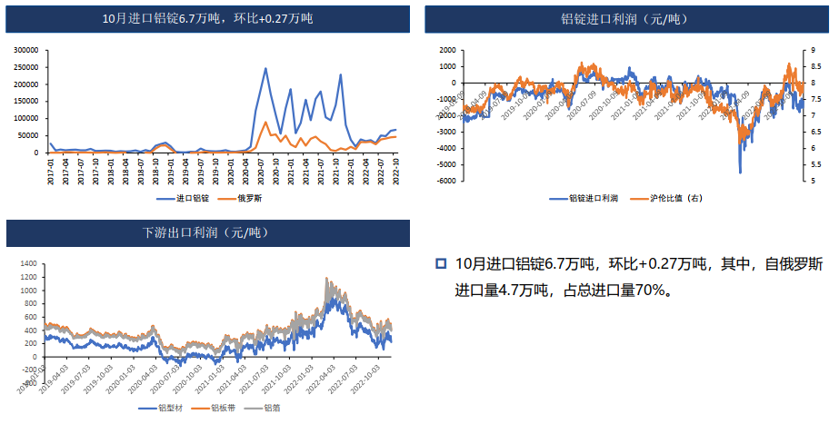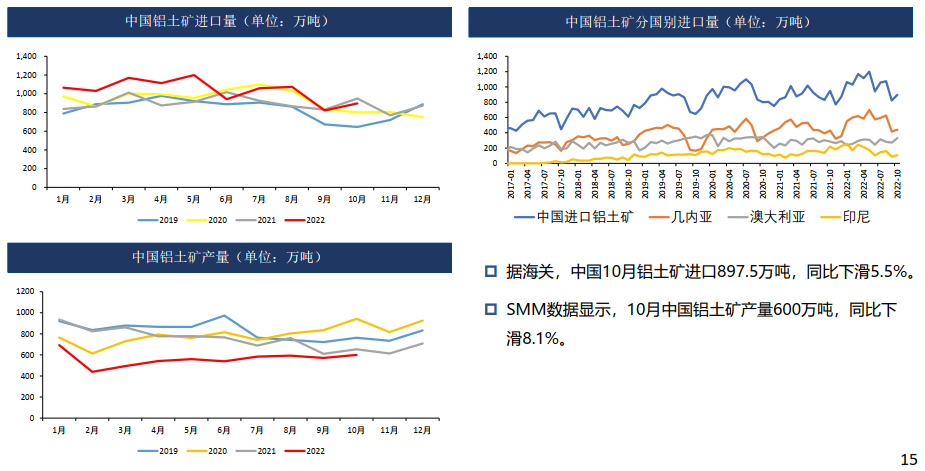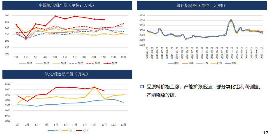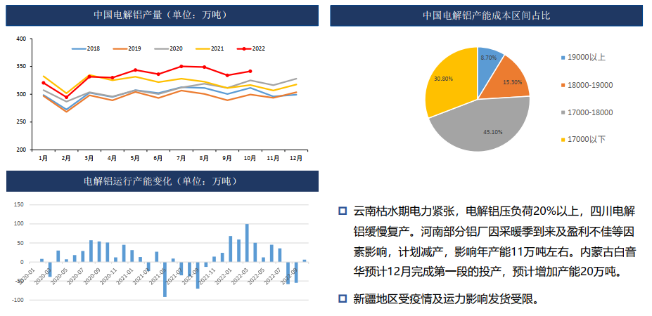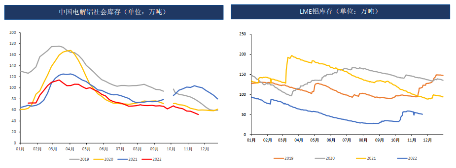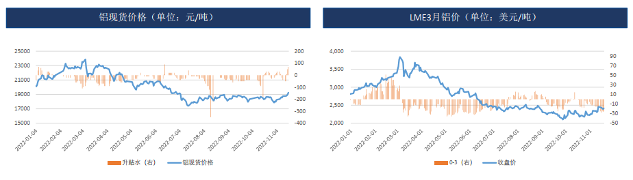 11月受大會后疫情管控放松、國內宏觀刺激政策密集出臺,產業上國內電解減產不斷,庫存低位,氧化鋁利潤微薄,為鋁價形成一定支撐,鋁價偏強震蕩。