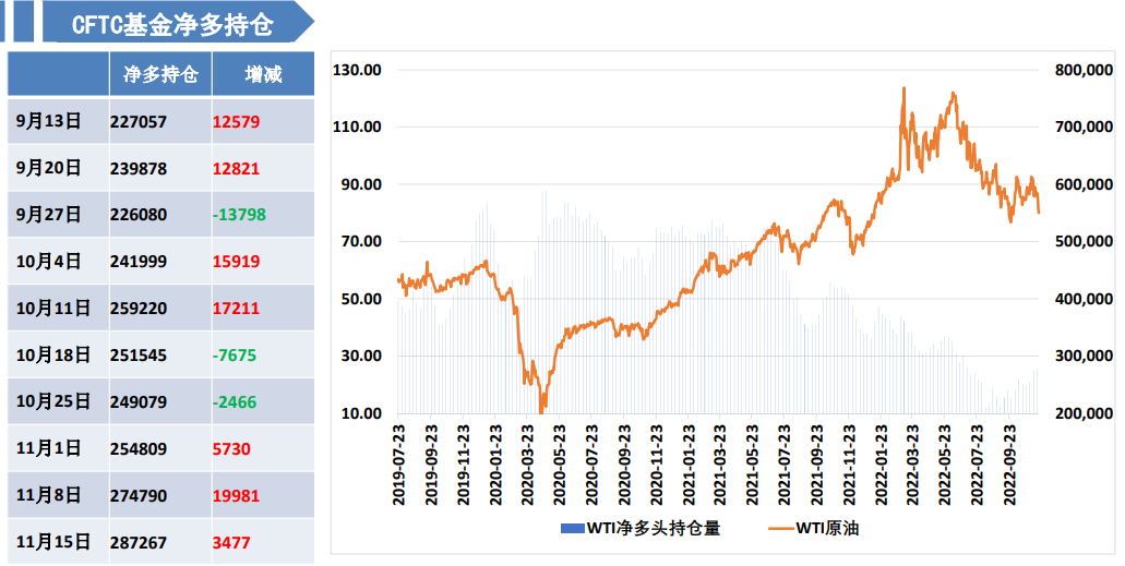 5.主力持倉:截至11月8日,CFTC主力持倉多增;截至11月22日,ICE主力持倉多減;中性。