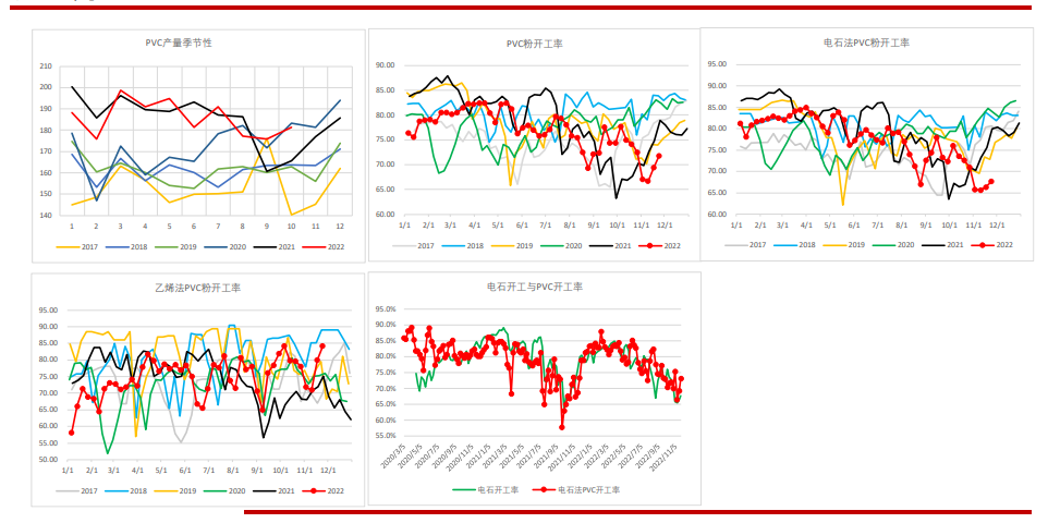 2022年10月PVC粉產量181.4039萬噸,較9月份增加3.14%,同比增加9.47%,累計同比增長0.07%。上周PVC開工率上升2.38個百分點至71.76%,其中電石法開工環比上升1.28個百分點至67.65%,外采電石法開工有明顯回升,乙烯法開工環比上升4.11個百分點至8.99%。