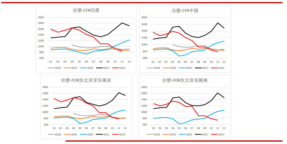 11月21日,中國臺灣臺塑公布12月預售報價,CIF印度跌90美元/噸在750美元/噸,CFR中國跌55美元/噸在735美元/噸;CFR東南亞跌50美元/噸至730美元/噸。