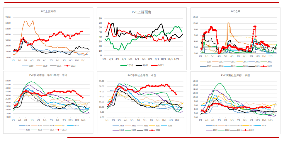 上周PVC上游小幅累庫0.36萬噸至45.6萬噸,社會庫存去庫1.8萬噸至26.95萬噸,其中華東去庫1.79萬噸,華南去庫0.01萬噸。PVC整體去庫,社會庫存同比增77%,上游庫存同比增184%。