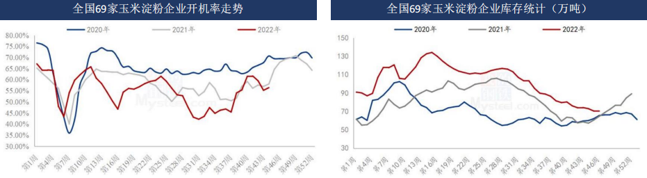 據Mysteel農產品調查數據顯示,本周玉米淀粉開工率及產量略有恢復。截至11月23日全國玉米加工總量為57.58萬噸,較上周玉米用量增加1.09萬噸;周度全國玉米淀粉產量為28.81萬噸,較上周產量增加0.61萬噸。開機率為56.4%,較上周升高1.19%。