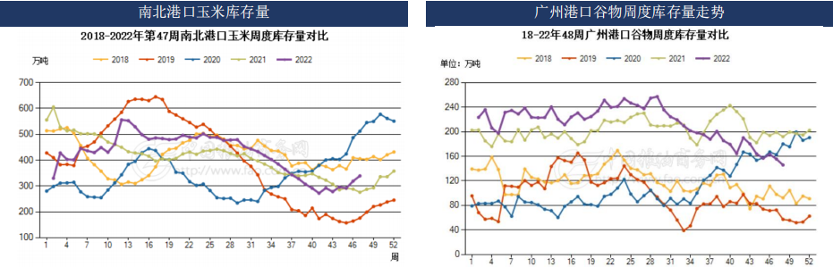 中國糧油商務網監測數據顯示,截止到2022年第47周末,南北港口玉米庫存量為339.20萬噸,較上周的318.80萬噸增加20.4萬噸,環比增加6.40%,較去年同期的275.90萬噸增加63.3萬噸,同比增加22.94%。