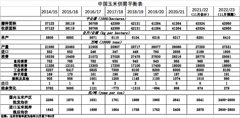 2021/22年度中國玉米進口量2189萬噸,出口量0.2萬噸,結余變化調整為674萬噸,其他估計數據不變。2022/23年度預測數據不做調整。