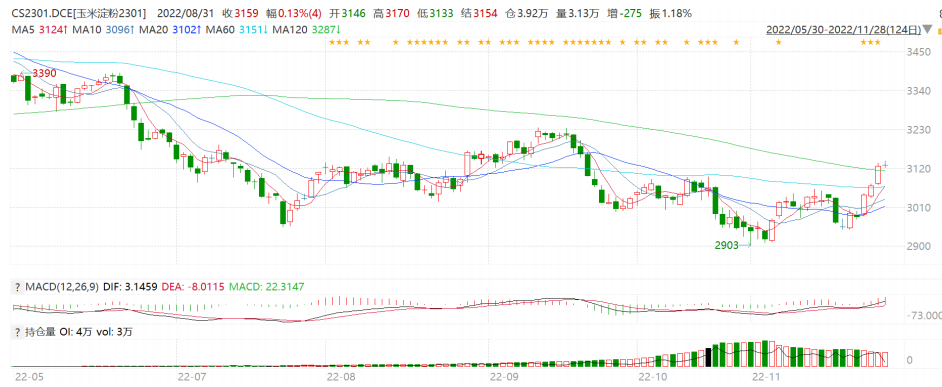 盤面來看,當前現貨維持強基本面,進口成本高企進一步支撐現貨價格;淀粉受原料及副產品價格支撐,表現強勢。12月預計玉米及淀粉價格仍將維持偏強結構,玉米關注盤面在3000元附近壓力。后期單邊及淀粉-玉米價差在售糧壓力有限的前提下,預計都將維持上漲結構。