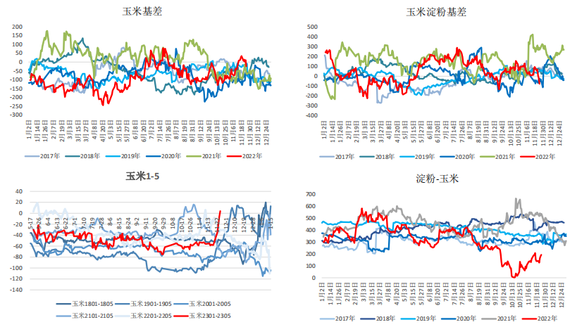 農戶惜售,市場供需偏緊格局下,玉米基差及1-5價差表現同樣強勢。受副產品價格高位及低庫存影響,淀粉利潤好轉,淀粉-玉米價差持續改善。