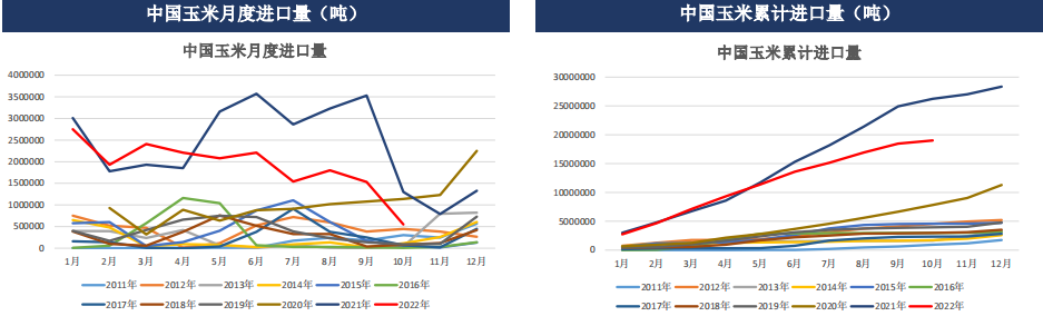 據中國海關數據顯示:2022年10月國內玉米進口量54.7萬噸,較2022年9月份153.4萬噸減少98.7萬噸,環比減64.3%;較2021年10月份130.3萬噸減少75.6萬噸,同比減58.0%。其中10月份進口均價為428.1美元/噸,環比增9.6美元/噸,同比增118.4美元/噸。