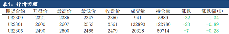 期貨合約價格偏弱運行。UR2301收盤價2561元/噸,跌幅0.89%,成交量132893手,持倉量122780手(-2696)。