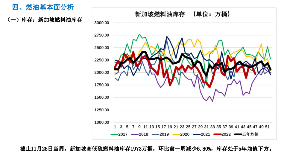 3、庫存:新加坡高庫存1973萬桶,環比前一周減少6.80%,庫存處于5年均值下方;偏多。