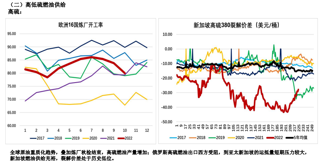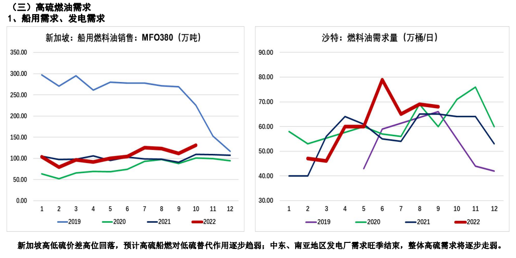 2、中東、南亞電廠采購高硫燃料油發電需求步入淡季,預計高硫需求將逐步下滑。