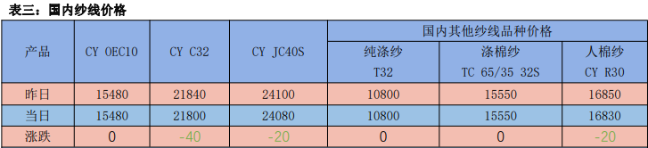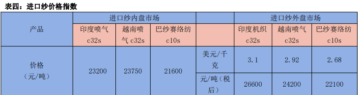 11月30日,現貨指數CCI3128B報價至14973元/噸(-25);CYIndexC32S報價22845元/噸(0);FCYIndexC32S(進口價格指數)報價25873元/噸(0);部分地區棉紗價格:湖北產C32S包漂帶票到貨23500元/噸浙江產高配緊密紡C32S帶票到貨價23000元/噸陜西產緊密紡JC60S較好品質帶票到貨30800元/噸。