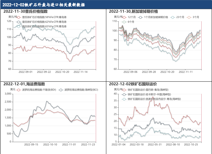 11月30日,58%Fe普氏價格指數為85.25美元/噸,較昨日上漲0.59%,62%Fe普氏價格指數為101.15美元/噸,較昨日下跌0.10%,65%Fe普氏價格指數為113.15美元/噸,較昨日下跌0.09%;11月30日,1個月新加坡掉期價格為100.69美元/噸,較昨日下跌0.09%,3個月為99.04美元/噸,較昨日下跌0.09%,6個月為97.24美元/噸,較昨日下跌0.06%,12個月為93.86美元/噸,較昨日下跌0.12%,23個月為88.70美元/噸,較昨日下跌0.16%。
