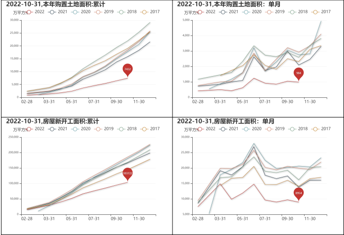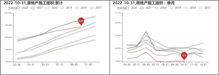 10月31日,房地產本年投資資金來源累計為125480.12億元,同比減少24.68%,單月為11182.05億元,較上個月減少17.05%,同比減少26.00%;房地產施工面積累計為888893.80萬平方米,同比減少5.72%,單月為9974.39萬平方米,較上個月減少2.89%,同比減少32.58%;房地產竣工面積累計為46564.58萬平方米,同比減少18.72%,單月為5685.61萬平方米,較上個月增加41.51%,同比減少9.43%;房地產銷售面積累計為111179.29萬平方米,同比減少22.27%,單月為9757.57萬平方米,較上個月減少27.89%,同比減少23.22%。
