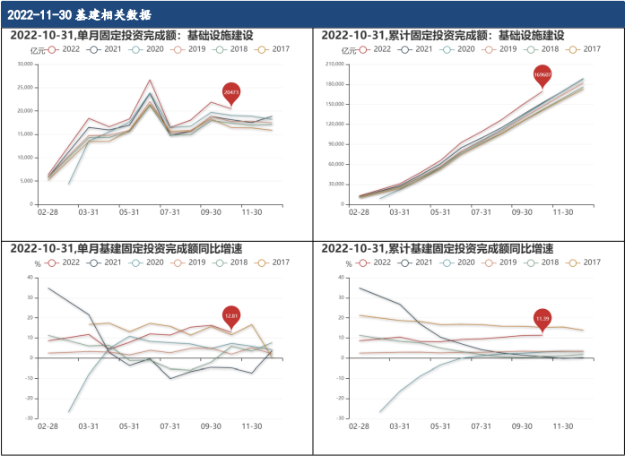 10月31日,基礎設施投資累計值為169606.91億元,同比增加11.39%,單月為20472.56億元,環比減少6.53%,同比增加12.81%。
