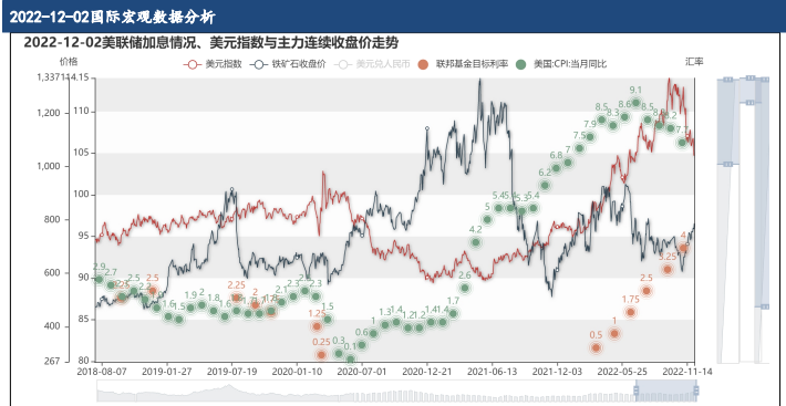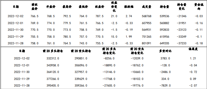 12月2日,合約收盤價為787.50元/噸,較昨日上漲2.74%,前20空頭持倉為290851.00手,較昨日減少4.98%,已連續減少10天,前20多頭持倉為332312.00手,較昨日減少3.39%,已連續減少5天。鮑威爾表示美聯儲或于12月起減小加息幅度,美元指數有所回落,使得盤面價格收到一定支撐。