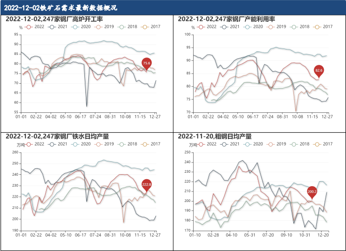12月2日,247家鋼廠高爐開工率為75.61%,較上周減少1.84%,產能利用率為82.62%,較上周增加0.12%,日均鐵水產量為222.81萬噸,較上周增加0.11%;11月20日,粗鋼日均產量為200.20萬噸,增加0.77%。