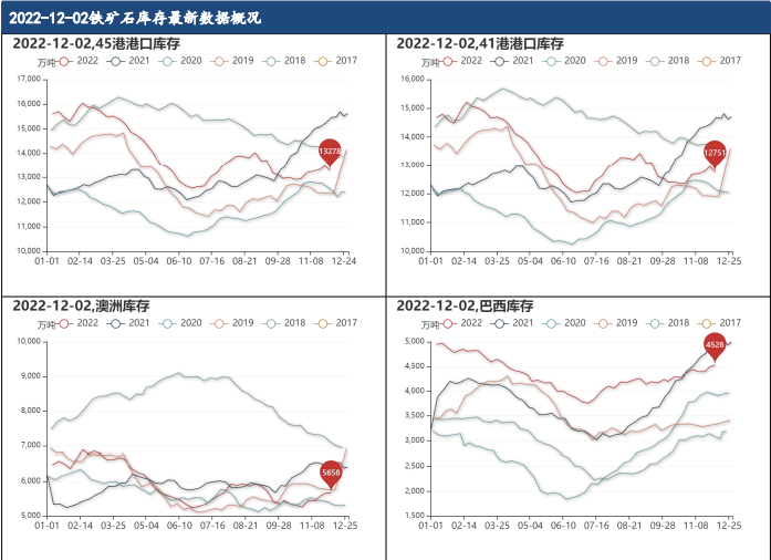 12月2日,45港鐵礦石庫存為13277.81萬噸,較上周減少1.53%,同比減少12.94%;41港鐵礦石庫存為12750.81萬噸,較上周減少1.65%;澳洲庫存為5657.65萬噸,較上周減少0.10%;巴西庫存為4526.04萬噸,較上周增加0.71%。