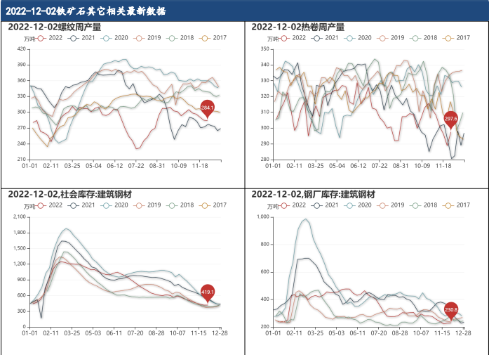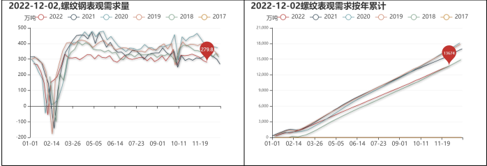 12月2日,建筑鋼材總庫存為649.92萬噸,較上周增加2.70萬噸,建筑鋼材社會庫存為419.08萬噸,較上周增加0.28萬噸,建筑鋼材鋼廠庫存為230.84萬噸,較上周增加2.42萬噸。螺紋鋼周產量為284.14萬噸,較上周減少0.74萬噸,已連續減少5周,熱軋板卷周產量為297.59萬噸,較上周增加8.75萬噸。螺紋表觀需求為279.77萬噸,較上周減少11.49萬噸,已連續減少4周,螺紋表觀需求年累計為13673.51萬噸,同比減少11.44%。
