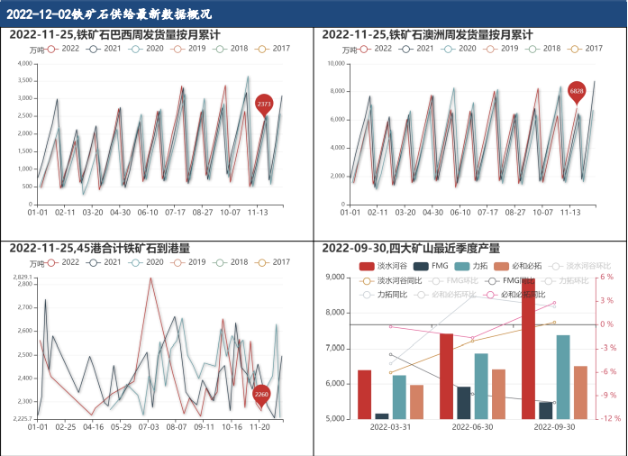 11月25日,鐵礦石澳大利亞月累計發貨量為6828.50萬噸,鐵礦石巴西月累計發貨量為2372.60萬噸,鐵礦石國內到港量為2260.40萬噸,較上周減少32.90萬噸,已連續減少2周。