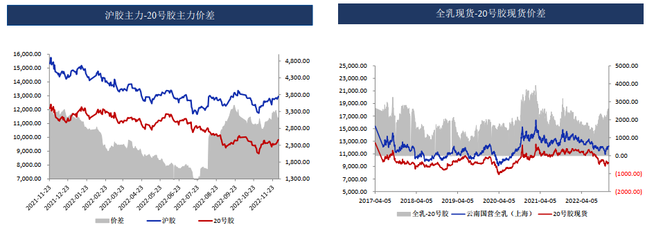 RU和NR的價差后續有再度走擴可能。去年深色膠強于淺色膠支撐兩者價差收窄的邏輯將不再存在,對應海外需求,隨著海外加息,深色膠持續走弱,今年交割品產量偏少表現相對偏強,RU-NR價差預計未來繼續有走強預期。