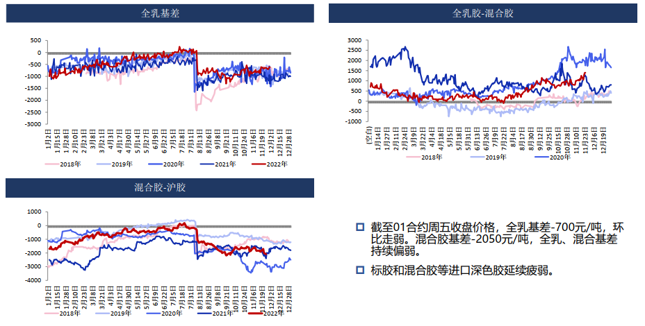 混合膠基差繼續走弱,全乳膠基差本周同樣走弱;