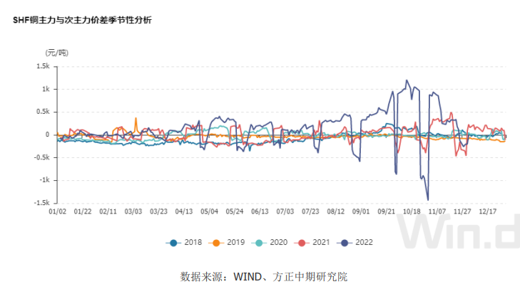 截止至2022年12月05日,滬合約CU2301收盤價為66,260元/噸,次主力合約CU2302收盤價為66,300元/噸,兩者收盤價價差為-40元/噸,較上一日減少30元/噸。從季節性角度分析,當前價差較近五年相比維持在平均水平。